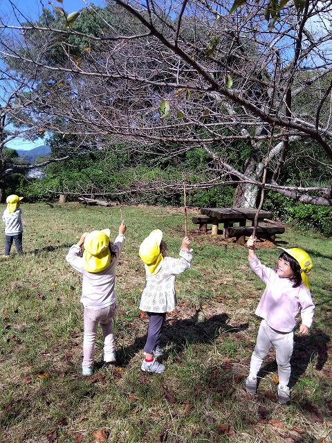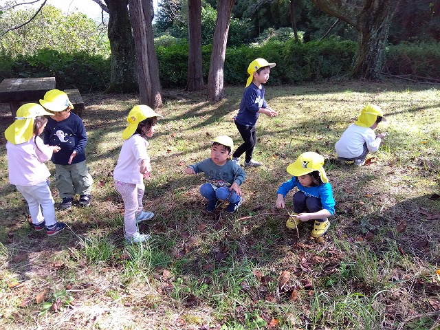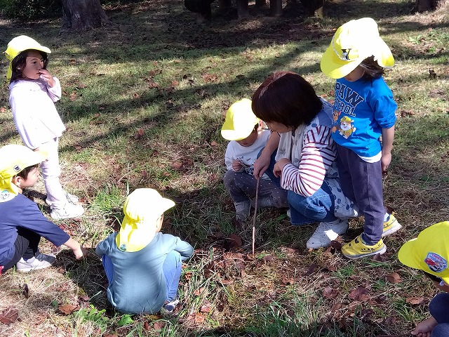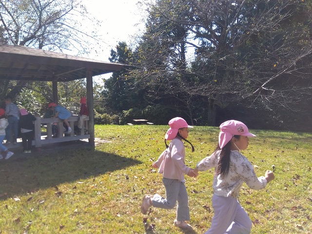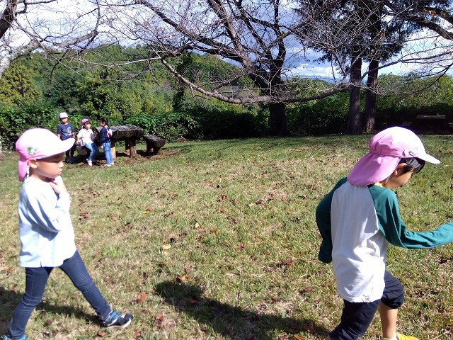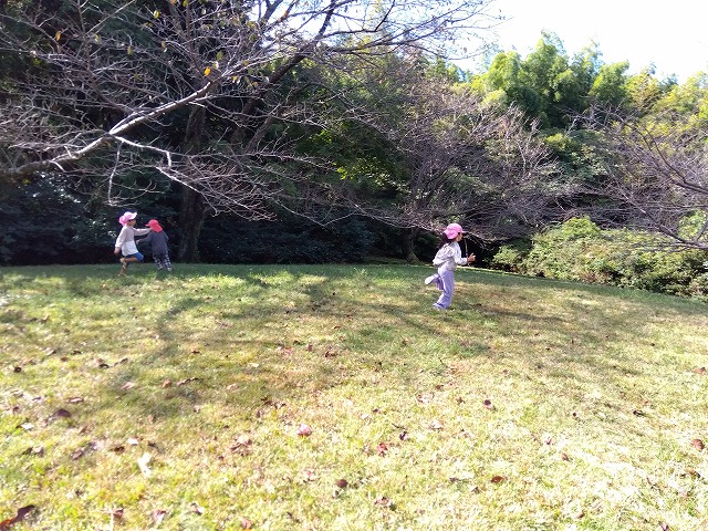 広場では、秋の自然にたくさんふれながら思いきり遊び、木の実や落ち葉など季節の恵みを見つけて楽しむ姿が見られました。