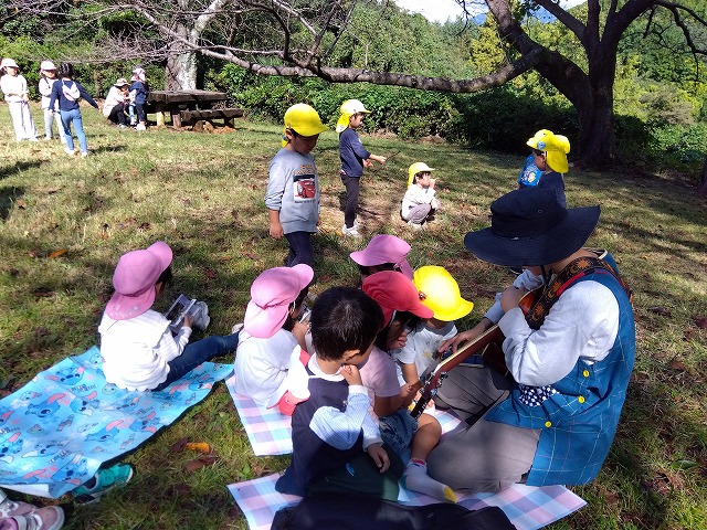 また、山の風の中で保育者のギターの音色に合わせて歌をうたうひとときもあり、自然と音楽に包まれた穏やかな時間を過ごしました。