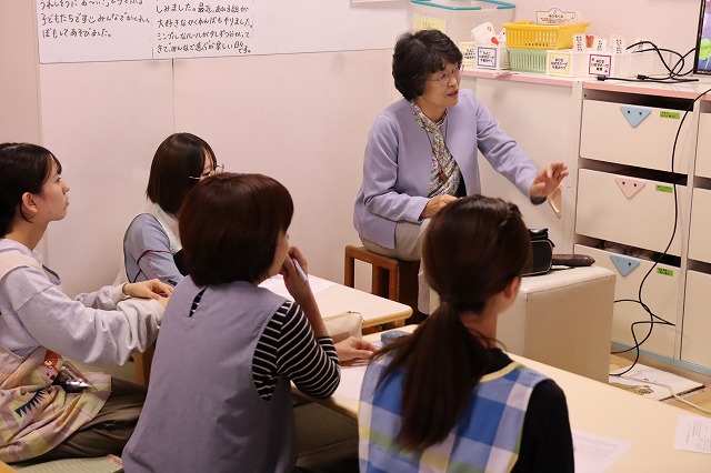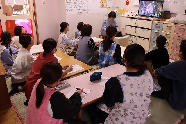 研修での学びを生かしながら、職員それぞれが日々の保育を振り返る時間を大切にしています。