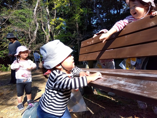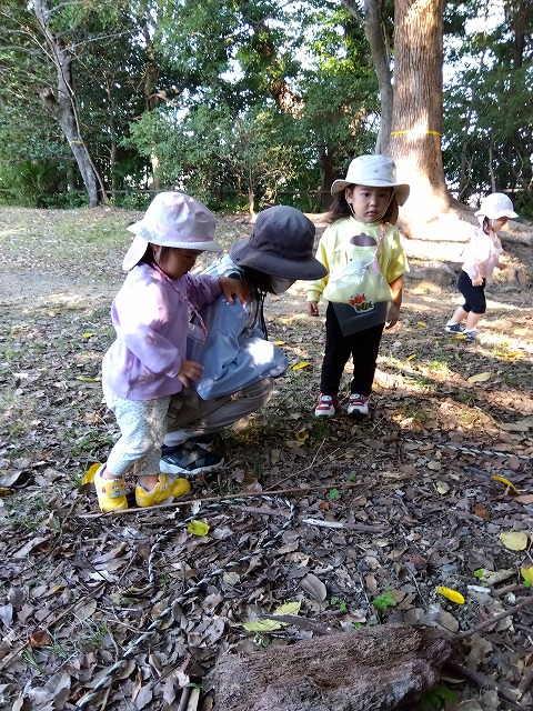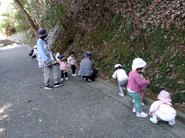 1歳児クラスは、少し足をのばして清水山の中腹まで行きました。道の途中にも小さな発見がいっぱいで、