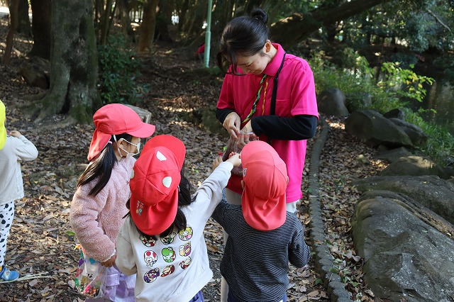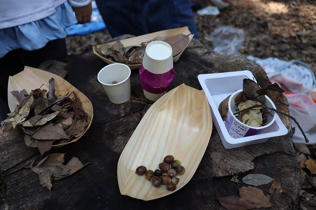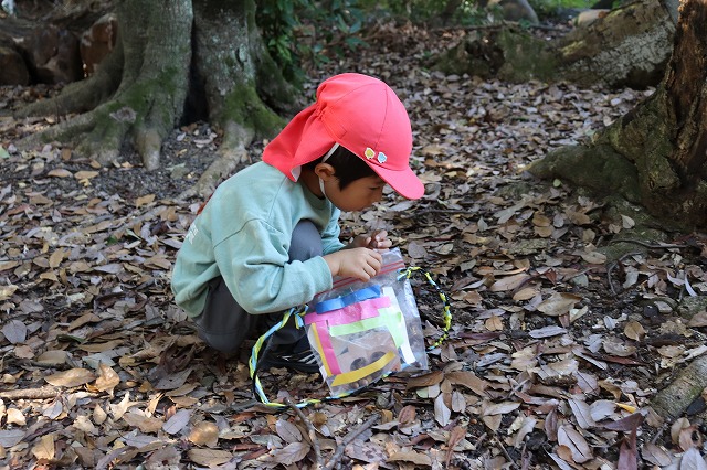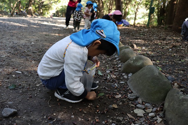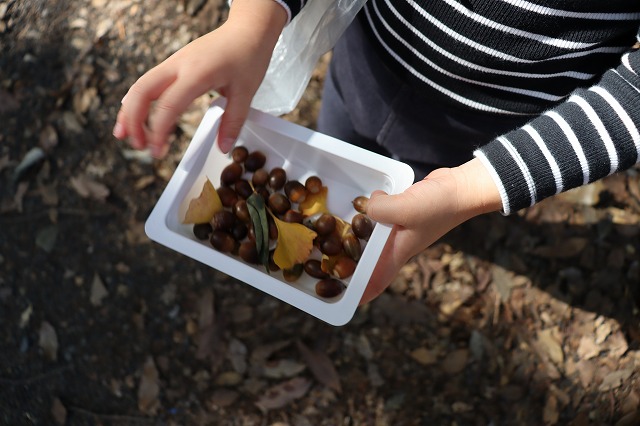 園の周りの自然の中には、落ち葉やどんぐり、木の実など、秋の恵みがたくさん見つかります。