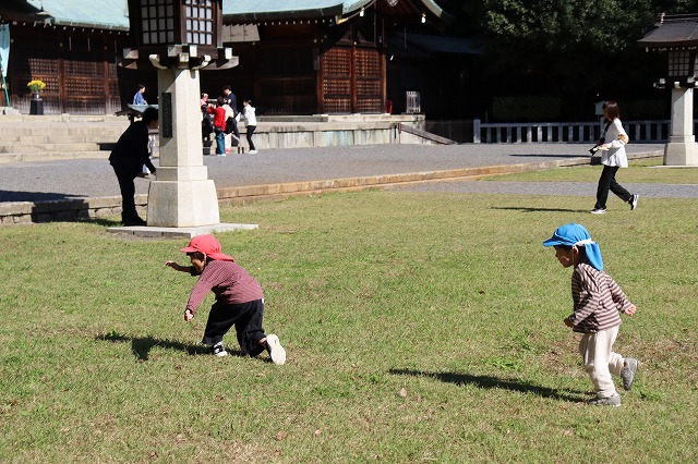 年少~年長クラスは、下の子たちの手を引きながら護国神社へ。
